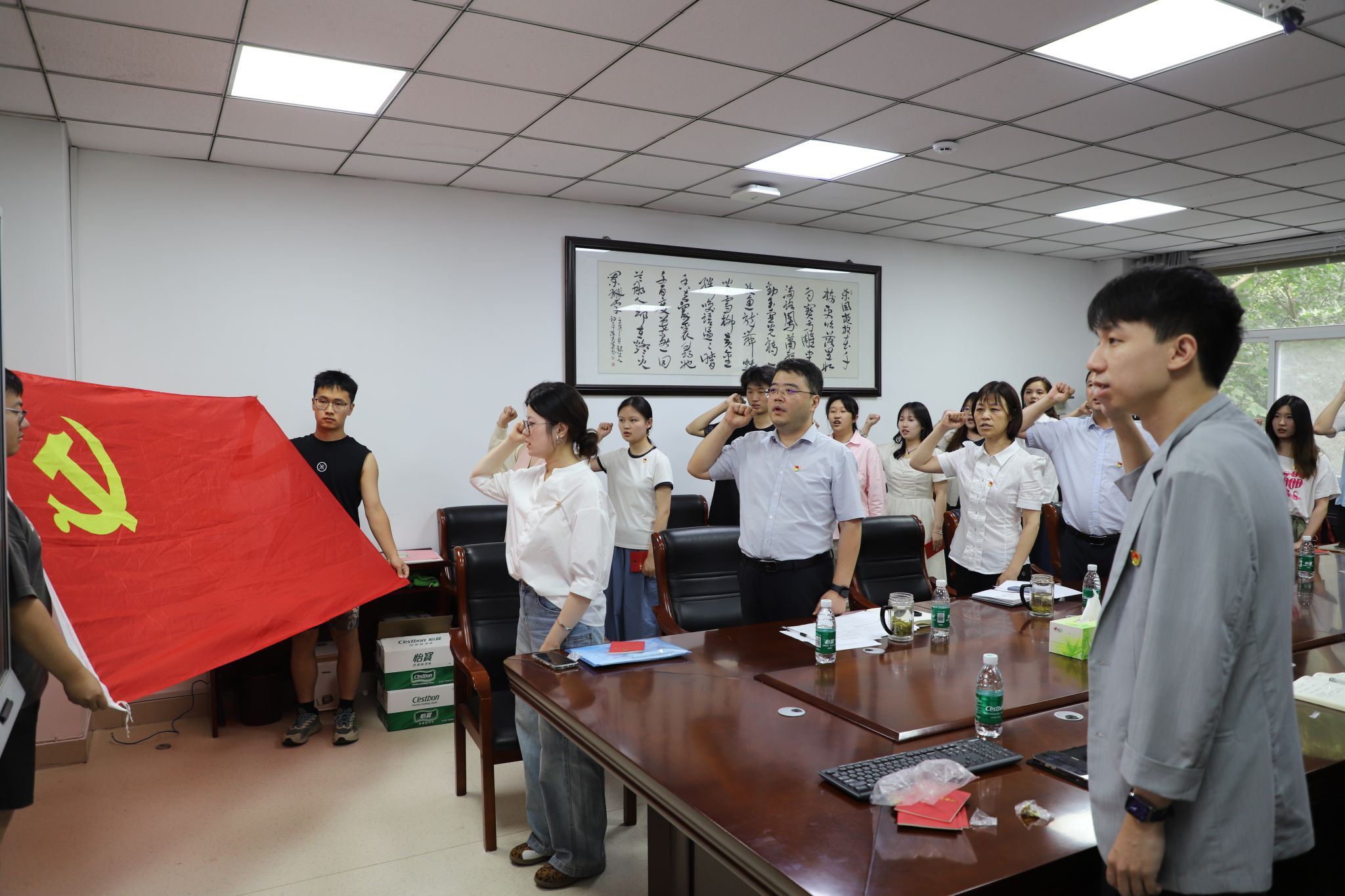 宣誓仪式在庄严的《国际歌》中拉开帷幕。在公司党委副书记吉帆的领誓下,面向鲜红的党旗,党员举起右拳,庄严宣誓。